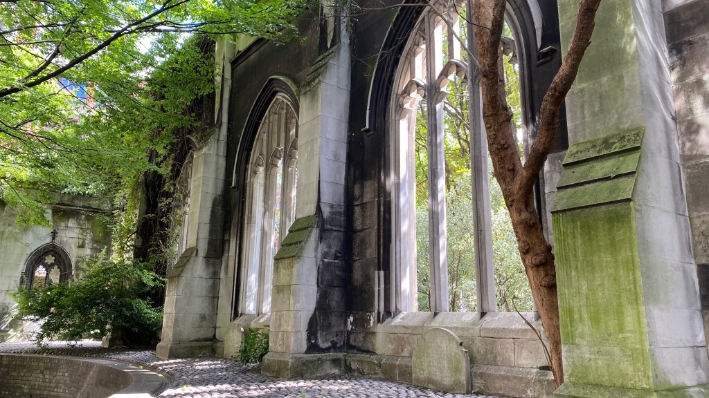 The rebuilt church was all but destroyed by Hitler’s bombs in 1941 — only the tower, steeple, and north and south walls survived. The ruins sat for sixteen years until in 1967 the City of London decided to turn the site into a public garden.