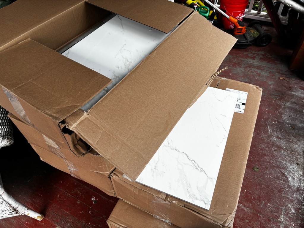 The old-timey shower kit arrived quickly and easily from Amazon. The special deep-soak plumbing stuff I needed arrived quickly via UPS. The tub arrives later today. Know what else arrived today? Eight very heavy cases of the wrong tile.