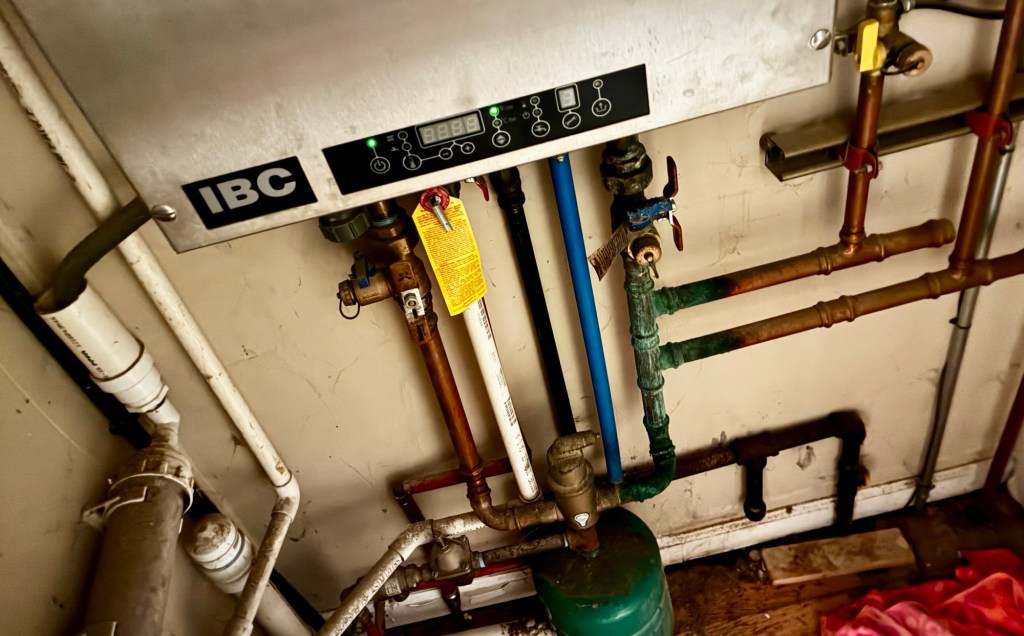 That, of course, was the end of my bath. After drying off and collecting my wits, I took a look at the “closet full of a million pipes,” and found this, with hot water gushing out of it —